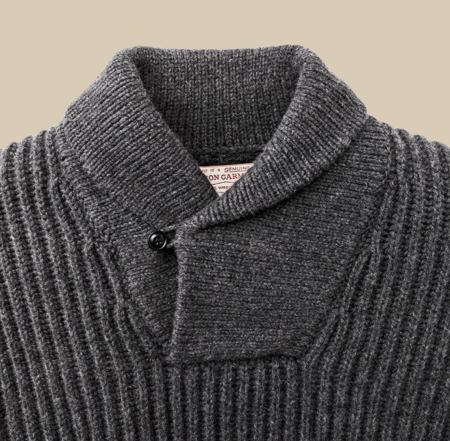The Bristol Shawl-Neck Sweater is crafted in Italy with 100% wool. This thick, dense pullover features a distinctive vertical fisherman's rib that adds warmth and structure. The shawl collar can be turned up for neck protection against cold wind. Rib-knit cuffs and hem hold their shape and seal in the heat.