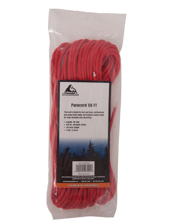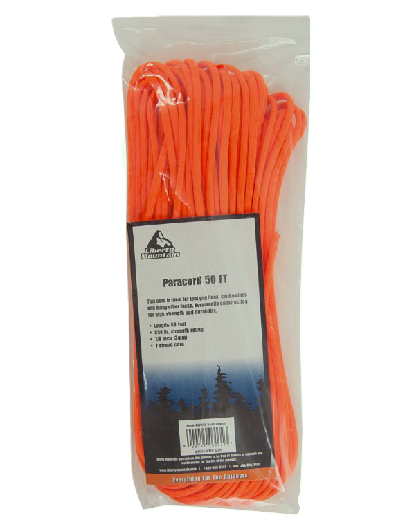 Paracord has hundreds of uses from tent guy lines and hanging bear bags to braiding survival bracelets. Liberty Mountain’s 100% nylon paracord, also known as 550 Cord, is a commercial Type III cord with a minimum break strength of 550 lbs. Kernmantle construction with an outer sheath and 7 inner strands. Inner strands can be removed from the outer sheath for use in a variety of survival situations. Diameter: 5/32” (4 mm). Break Strength: 550 lbs. Made in the USA.