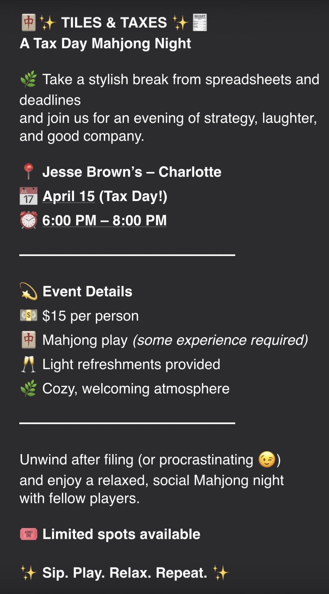 Shuffle up and prepare to be refunded with fun — it’s time to trade Tax Forms for tiles! Join us for a festive night of Mahjong, laughter, and a little Tax Day humor at Jesse Brown’s.